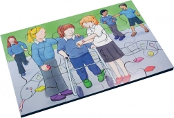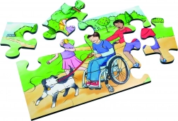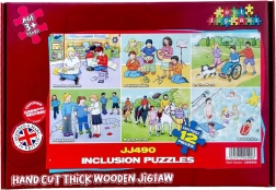 Otkrijte edukativne puzzle s 72 dijela, koje prikazuju scene koje uključuju pojedince s invaliditetom u svakodnevnim aktivnostima. Svaka slika promiče ideju integracije i međusobne pomoći. Ove puzzle pomažu djeci razumjeti ravnopravnost, empatiju i poštivanje različitosti drugih.