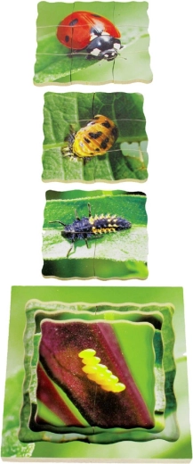 Otkrijte netipične obrazovne puzzle koje će zainteresirati i djecu i odrasle. Ove slojevite puzzle sadrže četiri faze razvojnog ciklusa bubamare: jaja, ličinku, kukuljicu i odraslu bubamaru, što je izvrstan način za razigrano upoznavanje prirode.