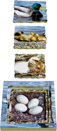 Obogatite djeci učenje našim drvenim slojevitim puzzlama koje prikazuju životni ciklus patke. Ove netipične puzzle sastoje se od slika četiri različite faze: