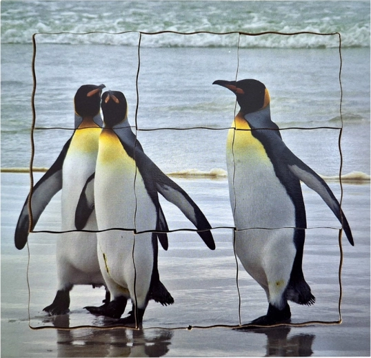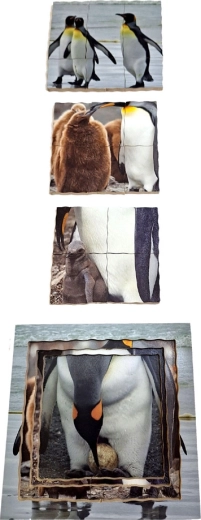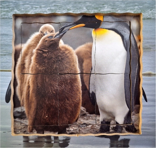 - Faze razvoja: Puzzle prikazuju jaja s roditeljem, tek izleglo mladunče, starije mladunče tijekom hranjenja i odrasle pingvine.