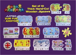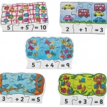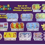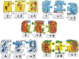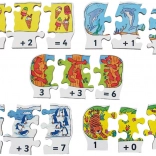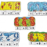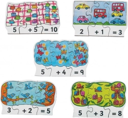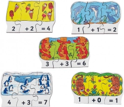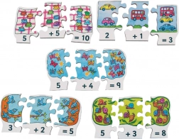 Ovaj jedinstveni set drvenih slagalica idealan je alat za male matematičare. Svaki od 30 dijelova prikazuje slike koje odgovaraju broju u donjem dijelu. Zadatak djece je ispravno spojiti uvijek 3 dijela kako bi dobili točan odgovor na jednostavan matematički zadatak. Slagalica nudi: