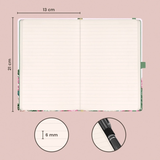 Stilizan linirani notes Notique Kakadu dimenzija 13 × 21 cm s čvrstim koricama, elastičnim zatvaranjem, petljom za olovku i unutarnjim džepom. Nudi 172 stranice na žutom papiru za vaše ideje, dnevnik i radne bilješke.