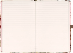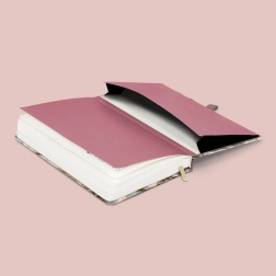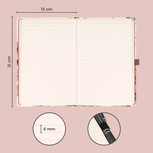 Elegantna bilježnica NOTIQUE s motivom puderastih cvjetova u praktičnom formatu 13 × 21 cm nudi 172 točkastih stranica na žutom papiru, tvrde korice, elastično zatvaranje, petlju za olovku i unutarnji džep – idealno za dnevnik, bilješke i planiranje.