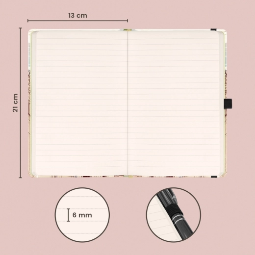 Elegantna bilježnica s crtama s tvrdim koricama i praktičnim gumicom za zatvaranje. Nudi petlju za olovku, unutarnji džep za sitnice i 172 točkaste stranice na žutom papiru za vaše ideje, dnevnike i radne bilješke.