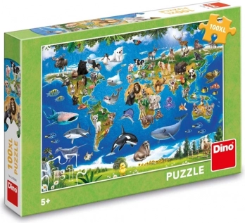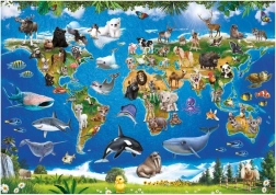 Vesele dječje puzzle s kartom svijeta i životinjicama izvrstan su alat za učenje geografije i upoznavanje faune pojedinih kontinenata. Zahvaljujući 100 XL dijelovima lako se slažu i malim rukama, a šareni motiv odmah će privući djecu.