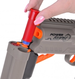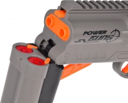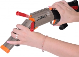 Ova masivna dječja dvocijevka idealna je za akcijske igre u kući i na otvorenom. Ističe se kvalitetnom plastičnom izradom, narančastim sigurnosnim akcentima i realističnim detaljima, uključujući izbacivanje praznih čahura pri ponovnom punjenju. Zahvaljujući dvostrukoj cijevi možete ispaliti jednu strelicu laganim pritiskom okidača ili obje odjednom jačim pritiskom.