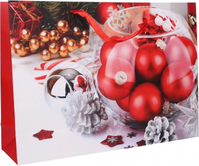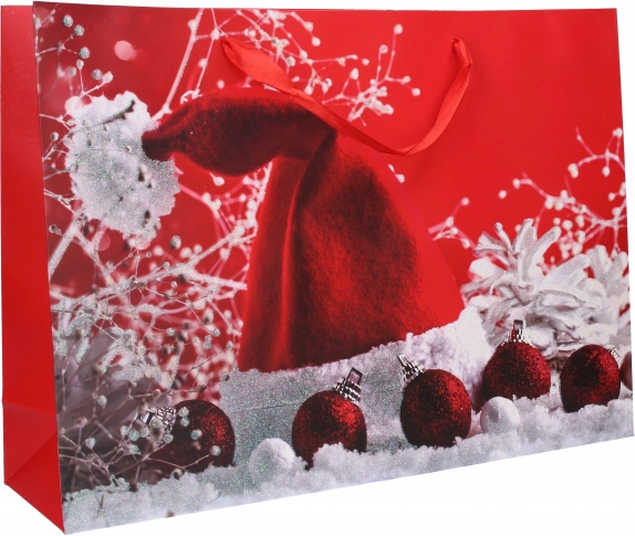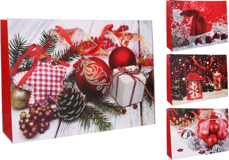 Ova prostrana božićna poklon-vrećica od čvrstog papira odličan je izbor za elegantno pakiranje darova. Zahvaljujući proširenom dnu i bočnim preklopima lako prima veće ili glomaznije predmete, dok čvrste ručke osiguravaju udobno i sigurno nošenje.