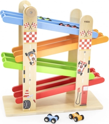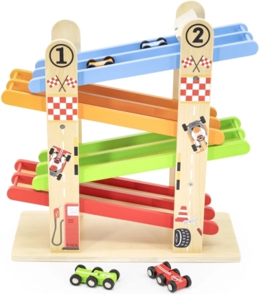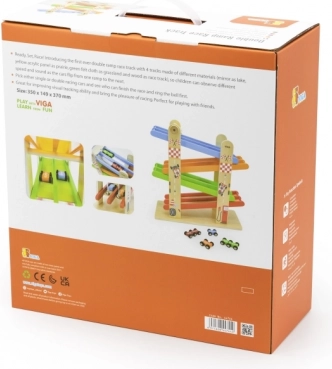 Zabavna drvena trkaća staza s dvostrukim putem od Viga donosi djeci beskrajne utrke i radost kretanja. Dvije paralelne staze omogućuju dvoboj dvaju autića istovremeno, a na cilju ih dočekuju zvonca. Izdržljiva izrada od lakiranog drva, bez oštrih rubova i s netoksičnim bojama sigurna je za male ruke. U kompletu su 4 šarena autića u dvjema izvedbama (s 4 i 6 kotača) koja potiču motoriku, koordinaciju oko–ruka i kroz igru upoznaju fizičke principe.