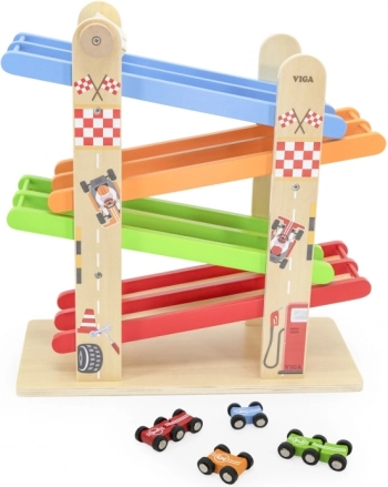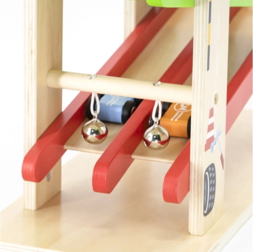 Ova robusna drvena staza nudi dvostruku rampu za napete utrke dvaju autića istovremeno. Djecu će privući žive boje i zvonca postavljena na cilju koja se oglase pri dolasku vozila. Konstrukcija je prilagođena malim dječjim rukama – glatki rubovi, stabilna baza i izdržljivi materijali jamče dug vijek trajanja i sigurnu igru.