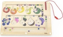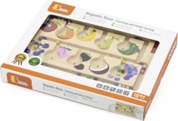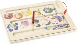 Ovaj kvalitetan drveni magnetski labirint odlična je edukativna igračka za razvoj dječje spretnosti. Djeca uz pomoć magnetske olovke pomiču obojene kuglice po označenim stazama, razvrstavaju ih prema bojama i pridružuju slikama voća ili brojevima. Igra potiče logičko razmišljanje, koncentraciju i koordinaciju oko–ruka.