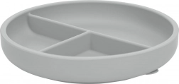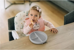 Moderni sivi silikonski tanjurić je dizajniran za samostalno jelo. On je mekan i lagan, što ga čini idealnim pratiteljem ne samo kod kuće, već i na putovanjima. Zahvaljujući prisustvu usisne čašice tanjurić ostaje čvrsto na svom mjestu, što olakšava hranjenje male djece.
