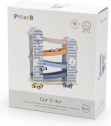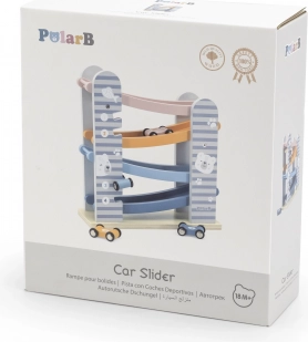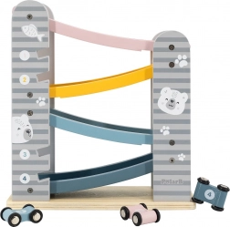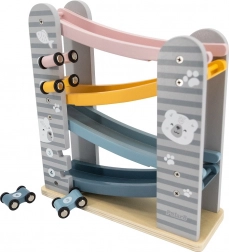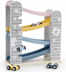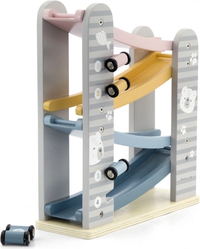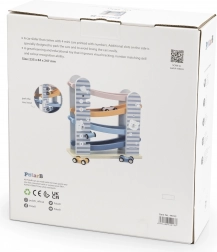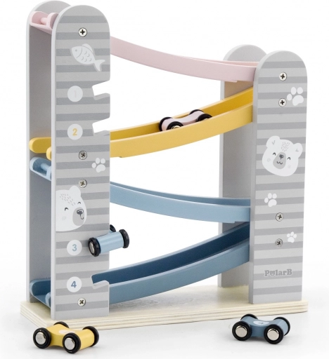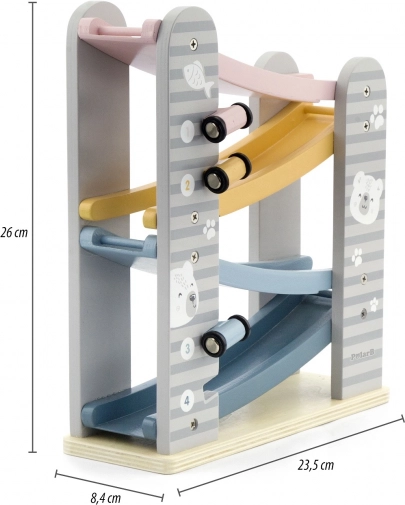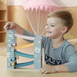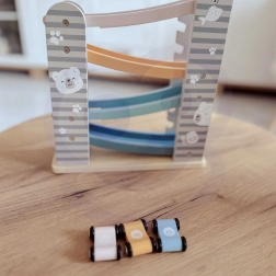 Ova drvena trkaća staza donosi sate zabave i razvija dječje sposobnosti. Dizajnirana je posebno za male dječje ručice, pa se ne morate bojati neugodnih oštrih rubova. U kompletu se nalazi: