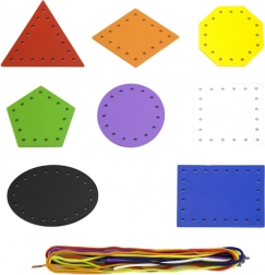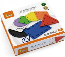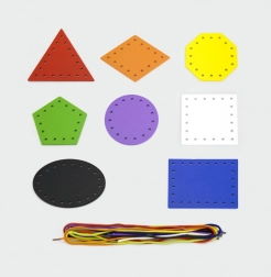Osam šarenih oblika i osam vezica potiče na razvrstavanje, sparivanje i imenovanje. Djeca uče boje i geometrijske oblike na zabavan način.