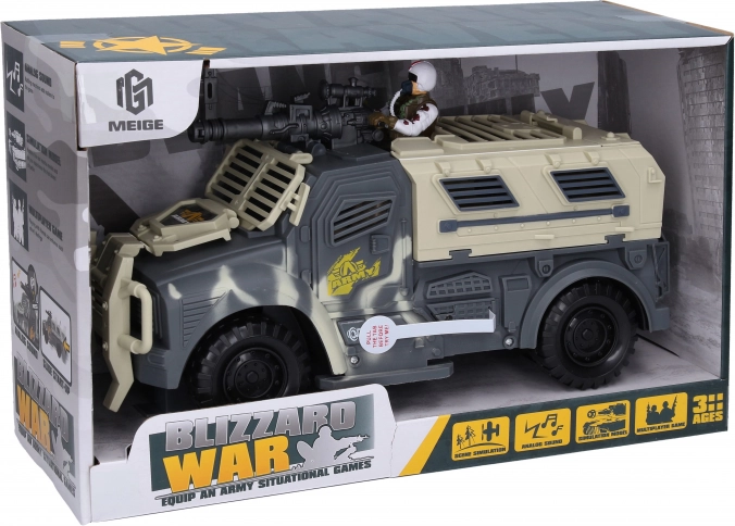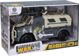 Ovaj vojni auto idealan je za djecu koja vole akcijske igre i vojnu tematiku. Auto veličine 31 cm opremljen je zvučnim i svjetlosnim efektima koji se aktiviraju gumbom na lijevoj strani auta. Zbog slobodnih kotača, kretanje auta je lako i prirodno. Vojni auto napajaju tri baterije AG13, koje su uključene u pakiranje.