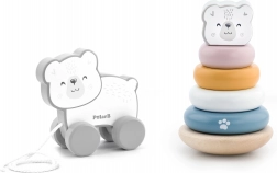 Igranje s piramidom razvija logiku, strpljenje i prepoznavanje boja, dok medvjedić na povlačenje prirodno potiče hodanje i koordinacijske vještine. Obje igračke izrađene su od kvalitetnog drva s glatkim rubovima za sigurno korištenje.