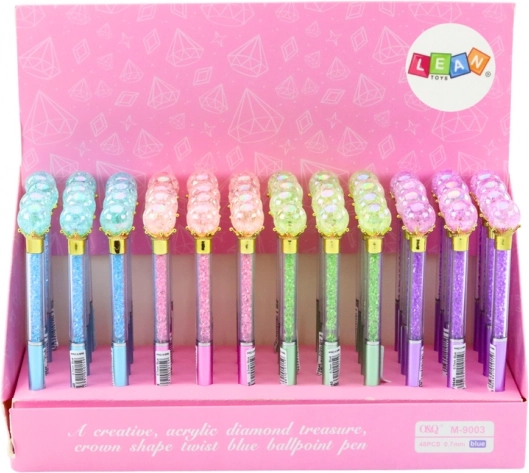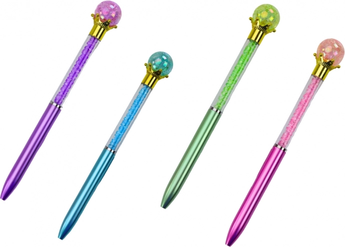 Stilna kuglična olovka s ukrasnom dijamantnom kuglom i prozirnim tijelom ispunjenim sjajnim kamenčićima. Piše plavom tintom (vrh 0,7 mm) i savršeno odgovara za svaki dan te kao elegantan dodatak. Dostupan je mix boja tijela – ružičasta, plava, zelena i ljubičasta.