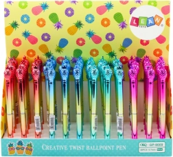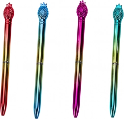 Stilna kuglična olovka sa zlatnim tijelom i dekorativnim ananasom na vrhu spaja eleganciju i funkcionalnost. Piše plavom tintom s glatkim tokom i vrhom širine 0,7 mm, idealna za svakodnevne bilješke i kao poklon. Dostupna u zlatnoj izvedbi s kolor naglascima: ružičasta, plava, crvena, zelena.
