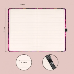 Stilna crtana bilježnica s motivom ljubičastih cvjetova, dimenzija 13 x 21 cm. Savršena za svakodnevne bilješke i ideje.