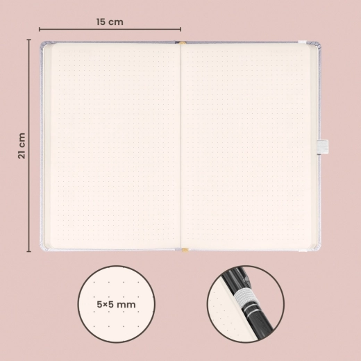 Zahvaljujući univerzalnom formatu 15 × 21 cm stane u većinu torbi i ruksaka, pa je možete uvijek imati sa sobom. Točkasta lineatura olakšava pregledno planiranje, izradu tablica i precizne sheme bilješki bez ometajućih punih linija.