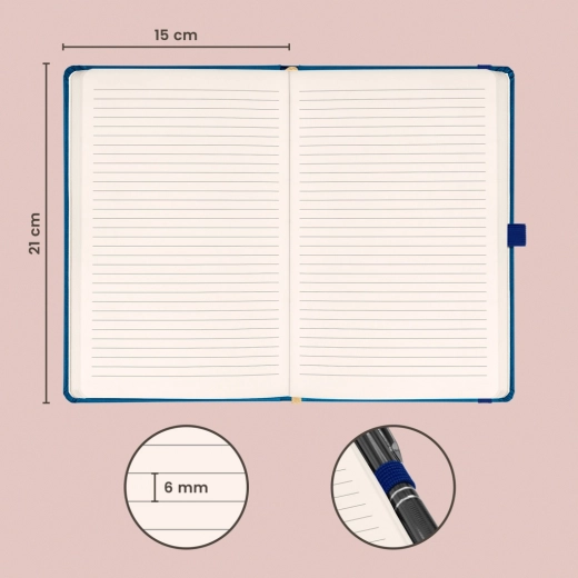 Elegantan linirani notes Notique Aprint u plavoj boji u univerzalnom formatu 15 × 21 cm. Nudi klasičan i bezvremenski dizajn, finu teksturu površine te mogućnost lakog utiskivanja (raza) poslovnog logotipa – idealno za ured, školu i reprezentativne poklone.