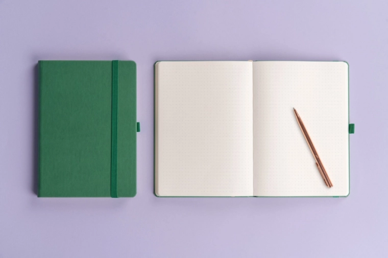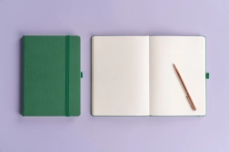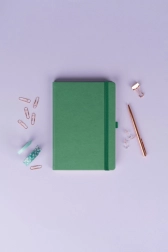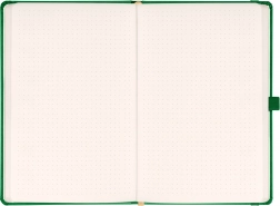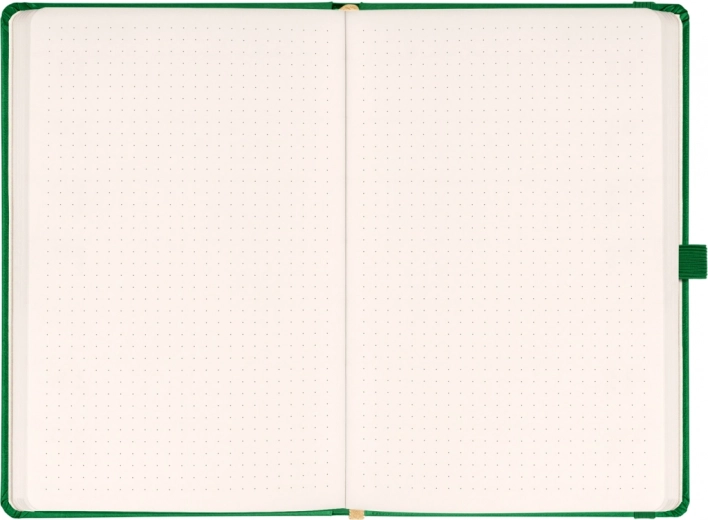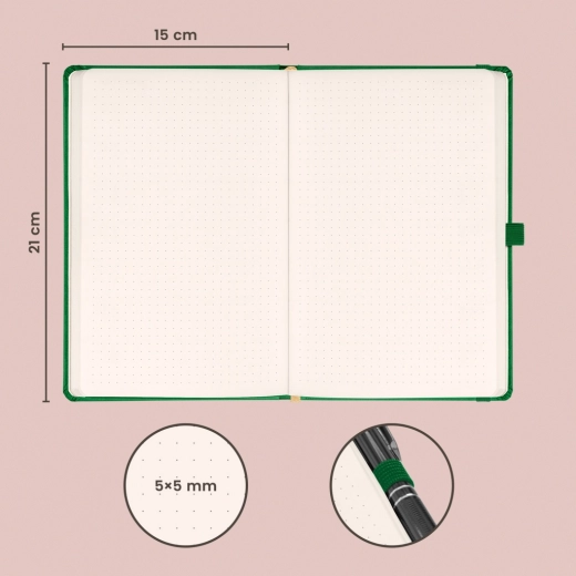 Stilna točkasta bilježnica NOTIQUE Aprint u elegantnoj zelenoj boji idealna je za svakodnevne bilješke, planiranje i kreativno skiciranje. Nudi točkasti raster za precizno pisanje i crtanje, format 15 × 21 cm za praktično nošenje te površinu pogodnu za suhi žig/logotip s finom teksturom.