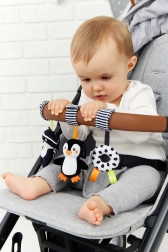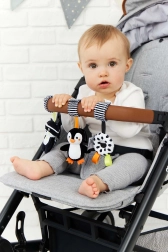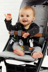 Igračku je lako pričvrstiti na različite površine poput kolica, dječjeg krevetića ili autosjedalice, što je čini idealnim pratiteljem na putovanjima i kod kuće.