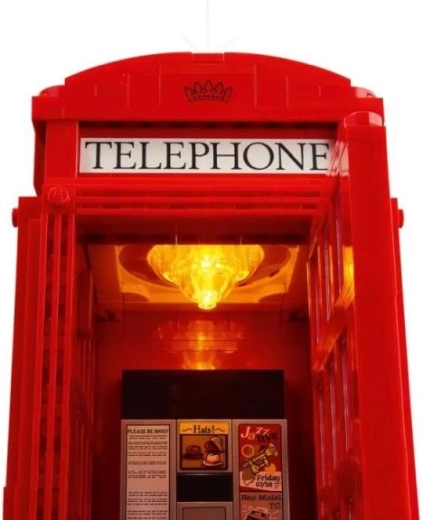 Model nudi izbor gradnje interijera: odaberite klasični telefon s okretnim brojčanikom ili varijantu u stilu 90-ih. Pritiskom na krov aktivira se svjetlosna kocka koja ističe detalje unutra. Zahvaljujući promišljenoj konstrukciji, govornica služi i kao praktični stalak za telefon.
