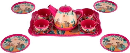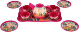 Set sadrži čajnik, šalice i tanjuriće s razigranim motivima životinja i cvijeća. Djeca mogu pozvati prijatelje, lutke ili plišance i vježbati komunikaciju, maštu i finu motoriku. Pogodno za djecu od 3 godine.