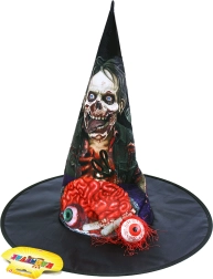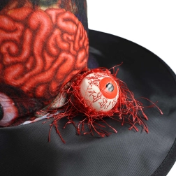 Strašan karnevalski dodatak za tinejdžere i odrasle: šešir s realističnim mozgom i izbočenim okom. Idealan za tematske zabave, maskenbale i Noć vještica. Lako se kombinira s kostimom i odmah privlači pažnju zahvaljujući svom jezivom izgledu i zabavnom efektu.