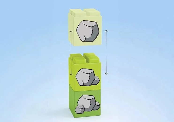 Sadrži figuricu i tri slagiva bloka s tiskom kamenja (1, 2 i 3), koji potiču učenje i kreativnu gradnju.