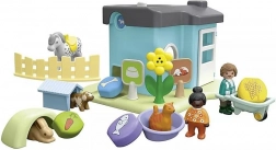 Set potiče prvo upoznavanje svijeta životinja – gdje vole odmarati, što jedu i kako se o njima brinuti. Vrata koja se otvaraju, krov koji se okreće, putokazi i cvijeće potiču maštu i donose nove scenarije igre. Djeca mogu gurati tačkiće, utovarivati i istovarivati, razvrstavati hranu i smišljati priče o tome je li hotel otvoren ili zatvoren i ima li još dovoljno hrane.
