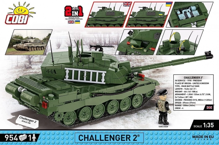 Otvorite poklopac na kupoli i smjestite unutra priloženu figuru tenkista s dvije varijante pokrivki za glavu (kaciga i beretka s britanskim amblemom). Odaberite između dva seta naljepnica i sastavite britansku ili ukrajinsku verziju. COBI kockice su proizvedene u EU, imaju postojane kvalitetne otiske i u potpunosti su kompatibilne s drugim markama.