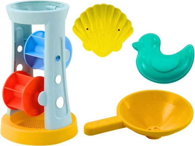 Dupli kotači mlina oživjet će svaku igru. Sito odvaja sitne čestice, a lijevak omogućuje ulijevanje vode ili pijeska i stvaranje efekata.