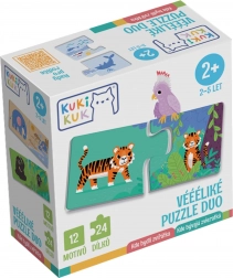 Véééliké puzzle duo: gdje žive životinje je zabavna edukativna igra u kojoj djeca traže i slažu ispravne parove životinje i njezina doma. Posebni oblik spojnih dijelova omogućuje povezivanje samo ispravnih sličica, pa se djeca prirodno uče kroz igru i odmah vide rezultat.