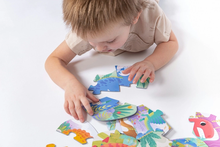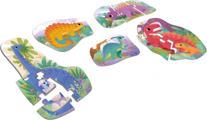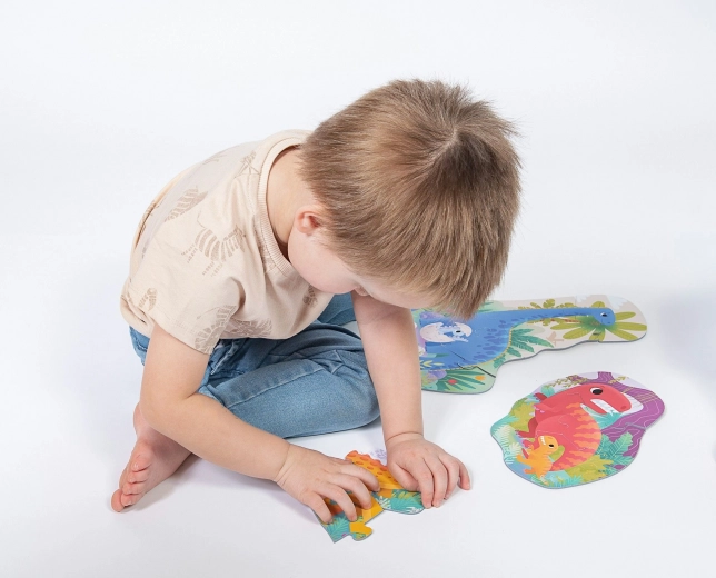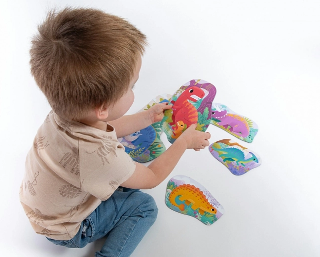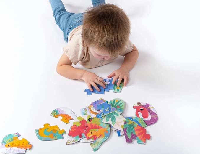 Svaki dinosaurus čini zasebnu slagalicu s pojednostavljenim oblikom. Djeca vježbaju slaganje i pritom otkrivaju svijet prapovijesnih stvorenja.