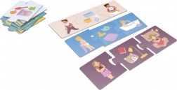 Na lijevom dijelu je dijete spremno za aktivnost, u sredini su pomagala ili igračke, a na desnom dijelu je sama aktivnost. Od 24 čvrsta dijela (karton 2 mm) složit ćete 8 tematskih trojki i možete ih poredati i kao vremensku crtu dana.