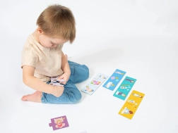 Djeca slažu trojke s istom bojom pozadine: lik – pomagala – aktivnost. Lako shvaćaju slijed i povezanosti.