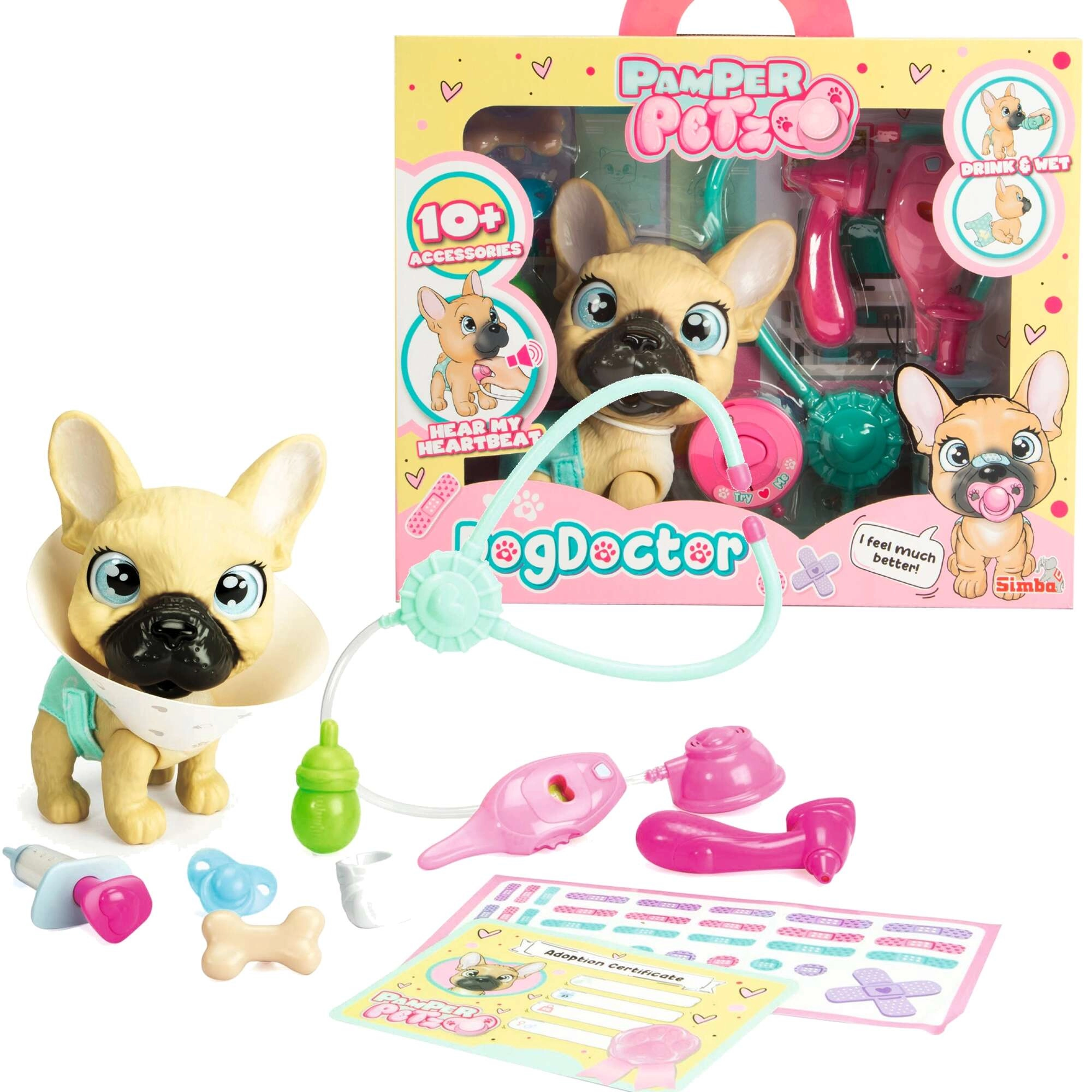 Dio seta je više od 10 njegovateljskih i medicinskih dodataka, uključujući stetoskop sa zvukom otkucaja srca, termometar, zaštitni ovratnik, bočicu, kost i zabavne naljepnice–flastere. Psić može držati pribor u njuškici i postat će omiljeni pratitelj za svakodnevnu igru.