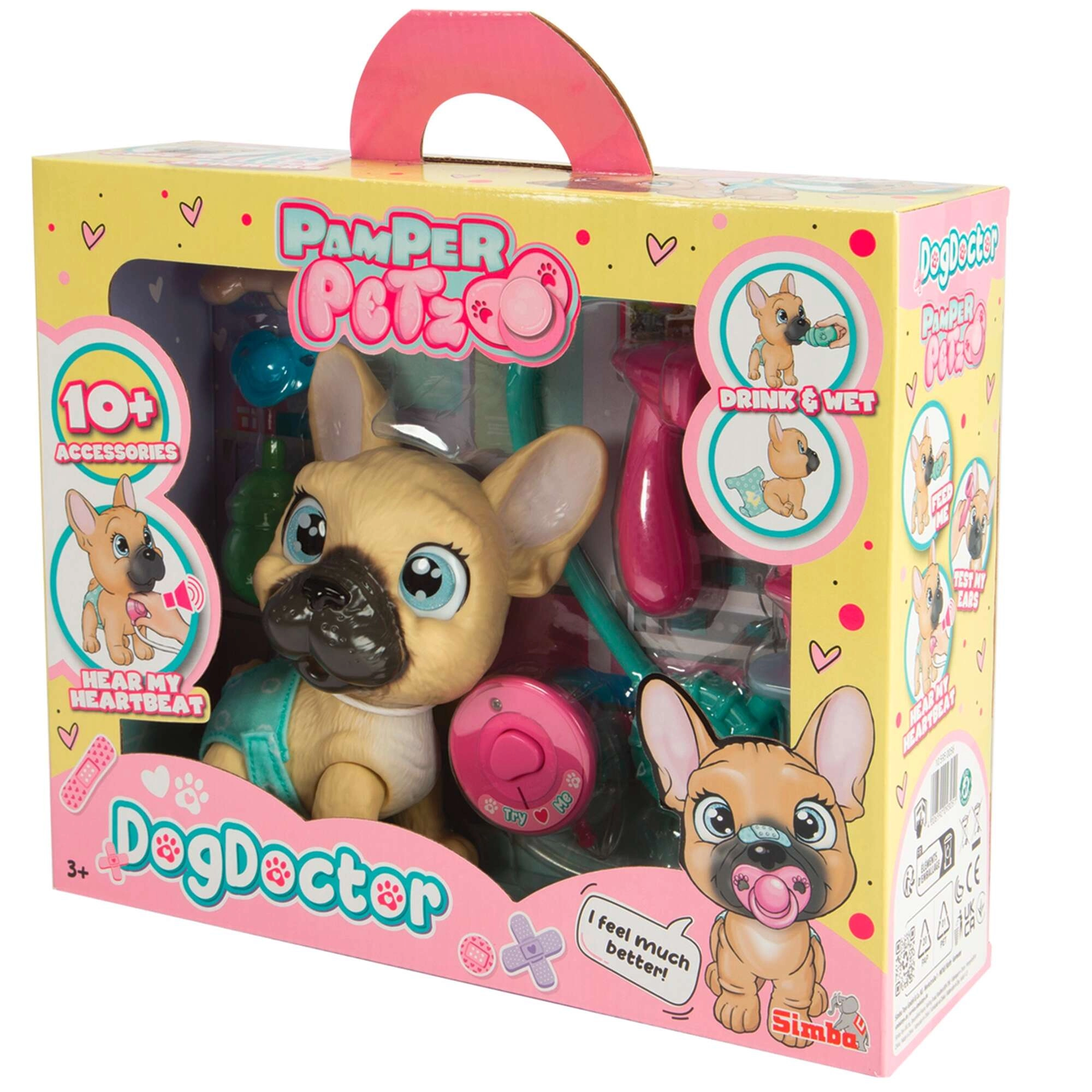 Sa setom PAMPER PETZ djeca se mogu igrati malog veterinara i doživjeti autentičnu brigu o ljubimcu. Štene francuskog buldoga pije iz bočice i mokri u pelenu koja mijenja boju – sjajan element za realističnu i poučnu igru. Magična šapica nakon brisanja vodom otkriva je li dječak ili djevojčica.