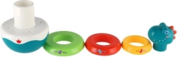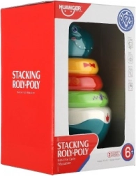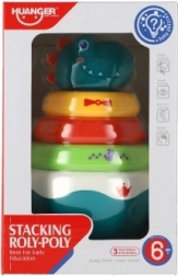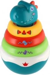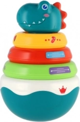 Ova razigrana složiva piramida s motivom dinosaura spaja zabavu i učenje. Zaobljeno postolje se pri laganom dodiru njiše u svim smjerovima i aktivira ugodan zvuk zvončića, koji prirodno stimulira sluh. Djeca vježbaju hvat, razvrstavanje prstenova prema veličini i prepoznavanje boja – idealno za prvo istraživanje svijeta.