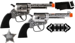 Postanite pravi kauboj! Ovaj zabavni set za male revolveraše sadrži 2 plastična pištolja duljine 19 cm, futrole za pojas i šerifsku značku, uključujući dodatke za autentičnu igru. Idealan za karneval, maškare i kućne avanture. Sigurna izrada s narančastim vrhovima i prikladno za djecu od 3 godine naviše.