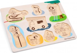 Slagalica sadrži osam komada, od kojih svaki ima svoj otisak i ručku za lako prihvaćanje. Ispod svakog komada nalazi se slika koja pomaže djeci pronaći ispravno mjesto.