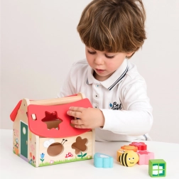 Ova kućica za razvrstavanje oblika idealna je igračka za djecu od 12 mjeseci. Kućica sadrži osam različitih oblika koje djeca uče prepoznavati i umetati u odgovarajuće otvore. Nakon dovršenog zadatka djeca mogu otvaranjem krova oblike lako izvaditi natrag.