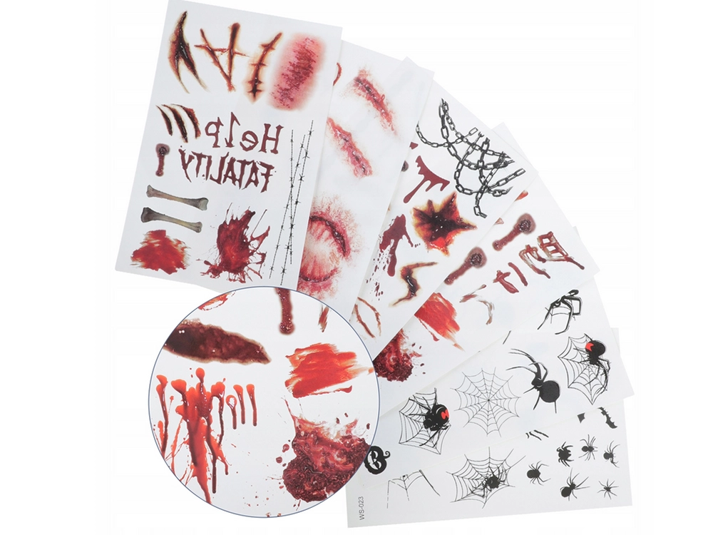 Zahvaljujući raznolikom spektru motiva lako ćete dotjerati make-up za Halloween, tematske zabave i fotografiranja. Svaki list donosi miks jezivih dizajna od krvavih špricanja preko paučina do dubokih ožiljaka – za maksimalno realističan efekt.