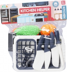 Otkrijte zabavu u kuhinji s ovim šarmantnim dječjim kuhinjskim setom! Ovaj komplet uključuje ne samo sudoper i stalak za suđe za realističnu igru, već i razne kuhinjske alate kao što su tri noža, brus za noževe i daska za rezanje. Set uključuje i gulilicu te nekoliko komada hrane kao što su nareziva mrkva, kukuruz i tikva, koji omogućuju realističnu igru.