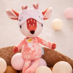 Srna Stella u ciglasto ružičastoj boji nosi slatku pidžamicu s džepićen i aplikacijom ptičice, koja potiče taktilnu i vizualnu percepciju. Masku za oči moguće je navući preko očiju, a nakon gašenja svjetla svijetli u mraku, što pruža osjećaj sigurnosti i ugode prije spavanja. Igračka je kvalitetno izrađena, mekana i nježna prema osjetljivoj dječjoj koži.