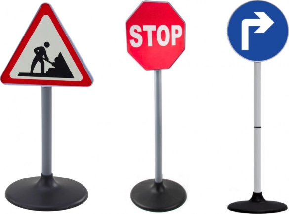 Praktičan edukativni set prometnih znakova pomaže djeci kroz igru usvojiti pravila cestovnog prometa. Sadrži tri realistična znaka: STOP, obavezan smjer desno i radovi na cesti. Zahvaljujući visini od 76 cm dobro su vidljivi, potiču sigurno ponašanje u prometu i razvoj kreativne igre. Izrađeno od izdržljivih materijala, prikladno za djecu od 3 godine, s CE certifikatom i normom EN71.