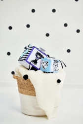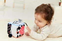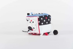 Ova mekana senzorna kocka osmišljena je za najmanje istraživače. Svaka od šest strana donosi drugačiji osjetilni doživljaj – od kontrastnih crno-bijelih uzoraka s obojenim akcentima do raznolikih tkanina i površina koje pozivaju na dodir i otkrivanje. Simpatični motivi krave i tigra potiču znatiželju i uče dijete prepoznavati oblike i emocije.