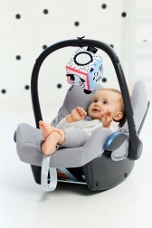 Izbočeni elementi poput kravljih ušiju i tigrastog repa olakšavaju hvatanje i vježbaju stisak. Praktični džepići s plišanom lopticom na vrpci potiču umetanje i vađenje, što je izvrsno za koordinaciju oko–ruka. Integrirano sigurno dječje ogledalce privlači pažnju i pomaže razvijati prepoznavanje vlastitog odraza, dok etiketice/vrpce na drugoj strani stimuliraju dodir i prstiće.