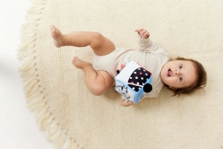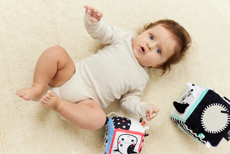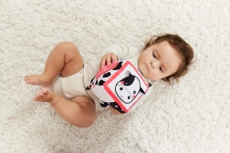 Visok kontrast crno-bijelih motiva s obojenim detaljima stimulira vid i zadržava pažnju bebe tijekom igre.